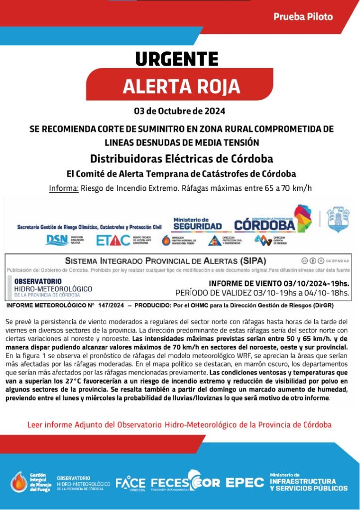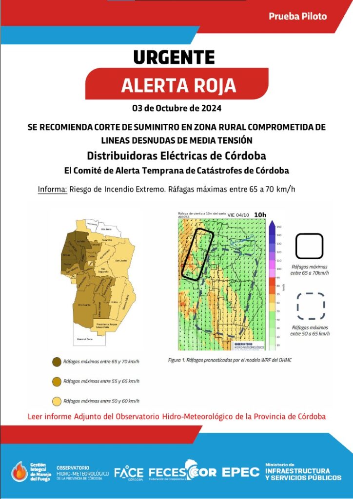 ➡️En virtud del Alerta Roja emitida por el Comité de Alerta Temprana de Catástrofes de Córdoba, donde se recomienda el corte del suministro en ZONA RURAL con riesgo de incendio forestal, se comunica que según el informe emitido, en la hora mencionada, el viento del sector Norte con ciertas variaciones al noroeste y noreste y a medida que se intensifiquen las ráfagas, se puede proceder al corte sugerido en las zonas de riesgos antes mencionadas.