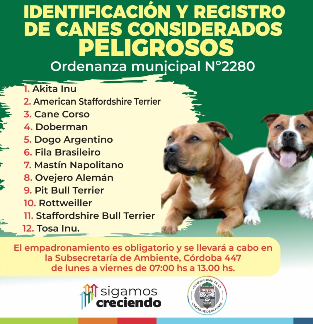 La Municipalidad de Deán Funes informa que cumplimiendo con la Ordenanza Municipal Nº 2280, se está realizando la Identificación y registro de canes considerados peligrosos: