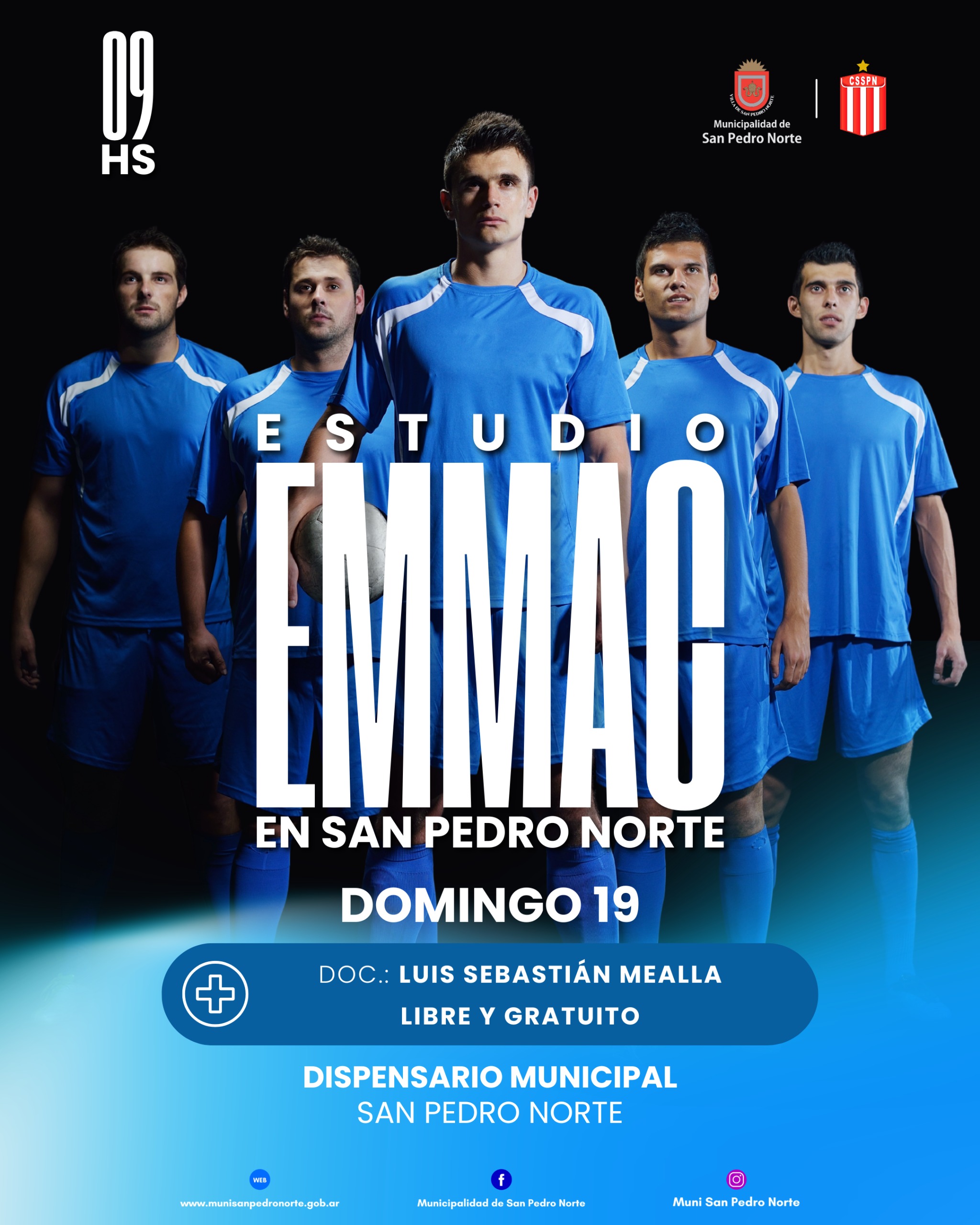 El domingo 19 de abril, en el dispensario municipal de San Pedro Norte, se realizarán Emmac, examen médico para la mediana y alta competencia. Los estudios estarán a cargo del médico Luis Sebastián Mealla y serán gratuitos para los deportistas de San Pedro Norte. Vale destacar que el Emmac es requisito necesario para participar de la Liga Ischilín de Fútbol.